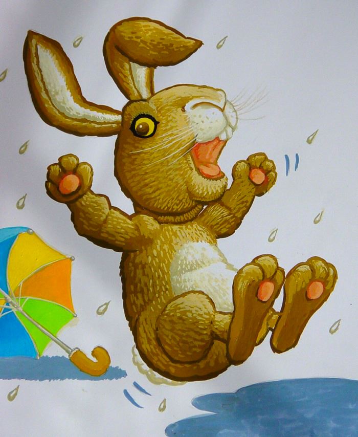 Here is the completed cover artwork for Hugo the Hare's Rainy Day. It doesn't look too great on white but when the background colour is added it will all come together. The shadows and movement lines will be a percentage of whatever colour the background turns out to be. For me finishing this painting is a relief as I know it will be the last illustration I have to do for the book. This is also (at least for now) the last book in my Nat the Cat trilogy. To see where it all began, you might like to take a look at my Nat the Cat Blog.