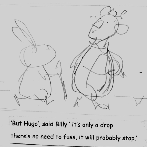 I know what I want to happen in each illustration and just scribble what’s in my head out on paper, sticking the text underneath. Of course the characters don’t look quite right but even in these scribbles it’s amazing what can be caught in terms of expression and movement.