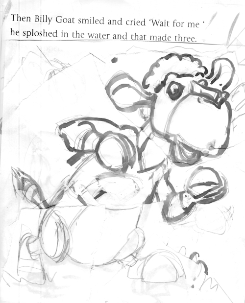 The next stage is to paint over the rough marks of the pencil sketches. As I do this I am refining them, making small alterations so that they become a bit more accurate. Billy starts looking more like Billy - the world of Nat the Cat is starting to materialise. I find that brush painting makes my line very fluid and produces a nice feel to roughs at this stage. These darker lines also produce a more substantial image which can be photocopied so my publisher can have a record of them. You will also notice that the text has now been set in the typeface from the book - the text of course takes up a certain amount of space on the page and you have to know how muich this is in order to determine what area is left for the illustrations.